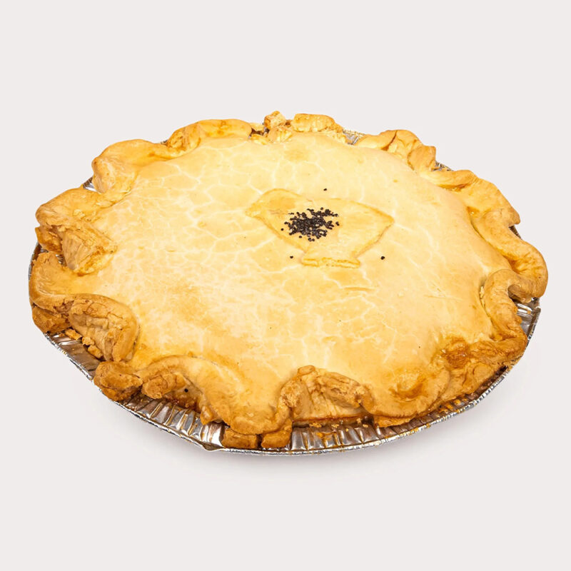 Chunks of juicy chicken with mushrooms & onions in a flaky pie crust. Sold frozen. Simply heat & serve.